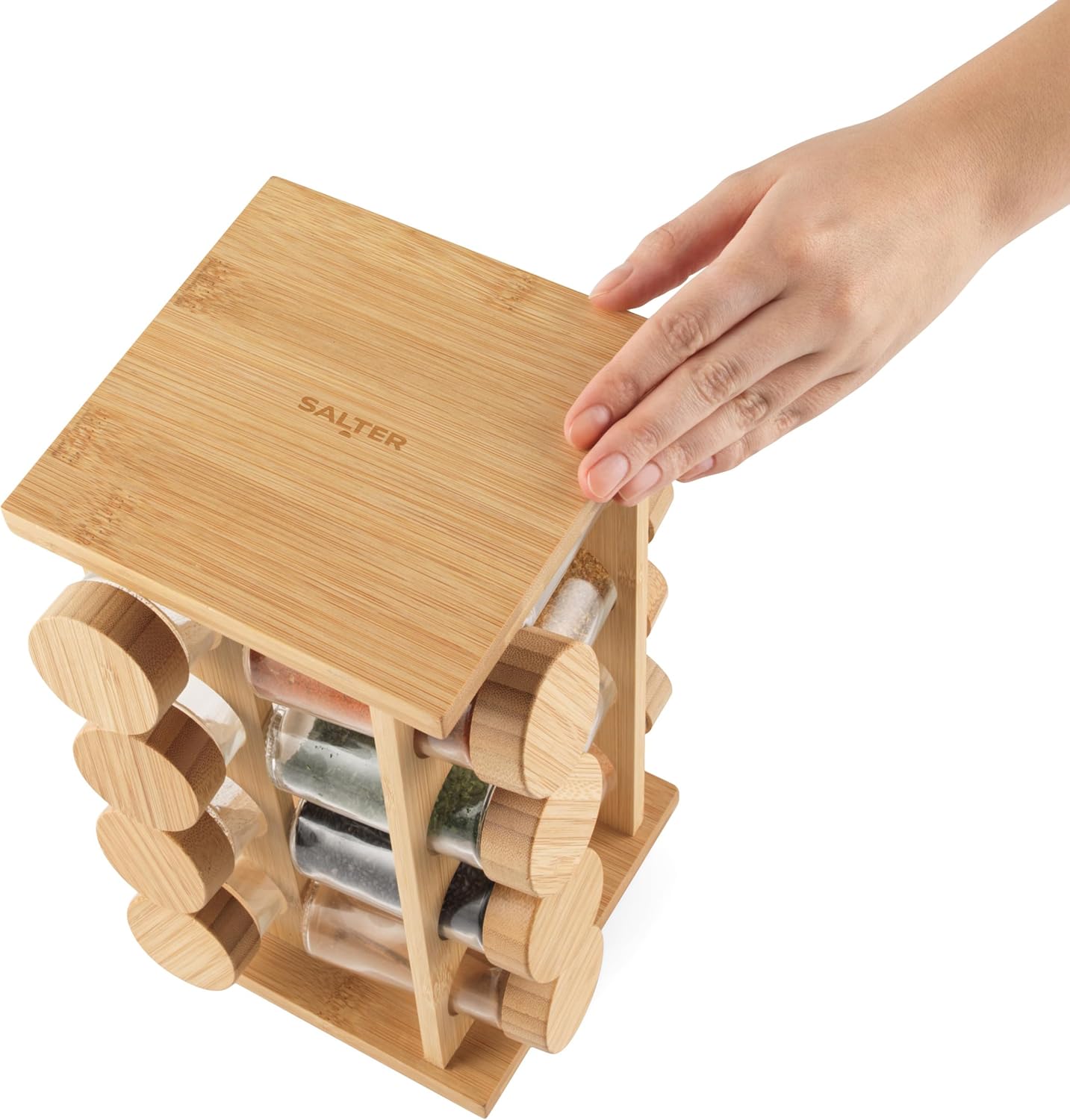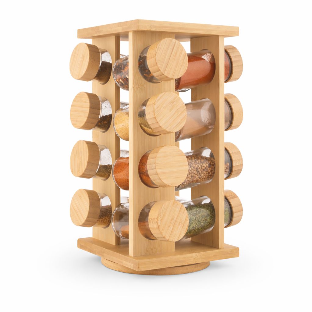 Dieses drehbare Gewürzkarussell sorgt für Übersicht und Ordnung in der Küche. Der stabile Ständer kombiniert Edelstahl mit natürlichen Bambuselementen und trägt 16 transparente Glasbehälter für häufig genutzte Gewürze. Durch die 360°-Drehfunktion sind alle Gläser schnell erreichbar, ohne Platz auf der Arbeitsfläche zu blockieren.